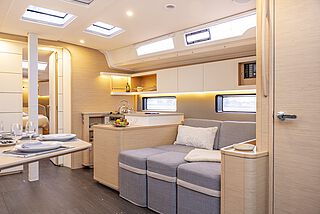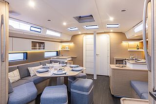 Der Salon wurde so entworfen, dass er maximalen Raum und Komfort bietet. Eine besondere Neuerung ist der sechseckige Tisch, den Dufour eingeführt hat. Er verleiht dem Salon ein frisches Design und bietet zusammen mit den beweglichen Hockern Platz für bis zu 10 Personen.
