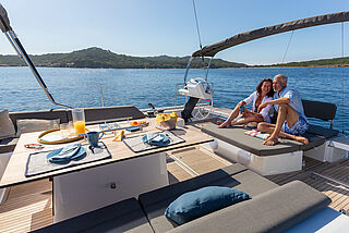 Den hinteren Teil vom Cockpit nutzt Dufour, um dort eine große Sonnenliege aufzubauen, welche sich mit einem flexiblen Mittelteil schnell zu einem zusätzlichen Cockpittisch konvertieren lässt.