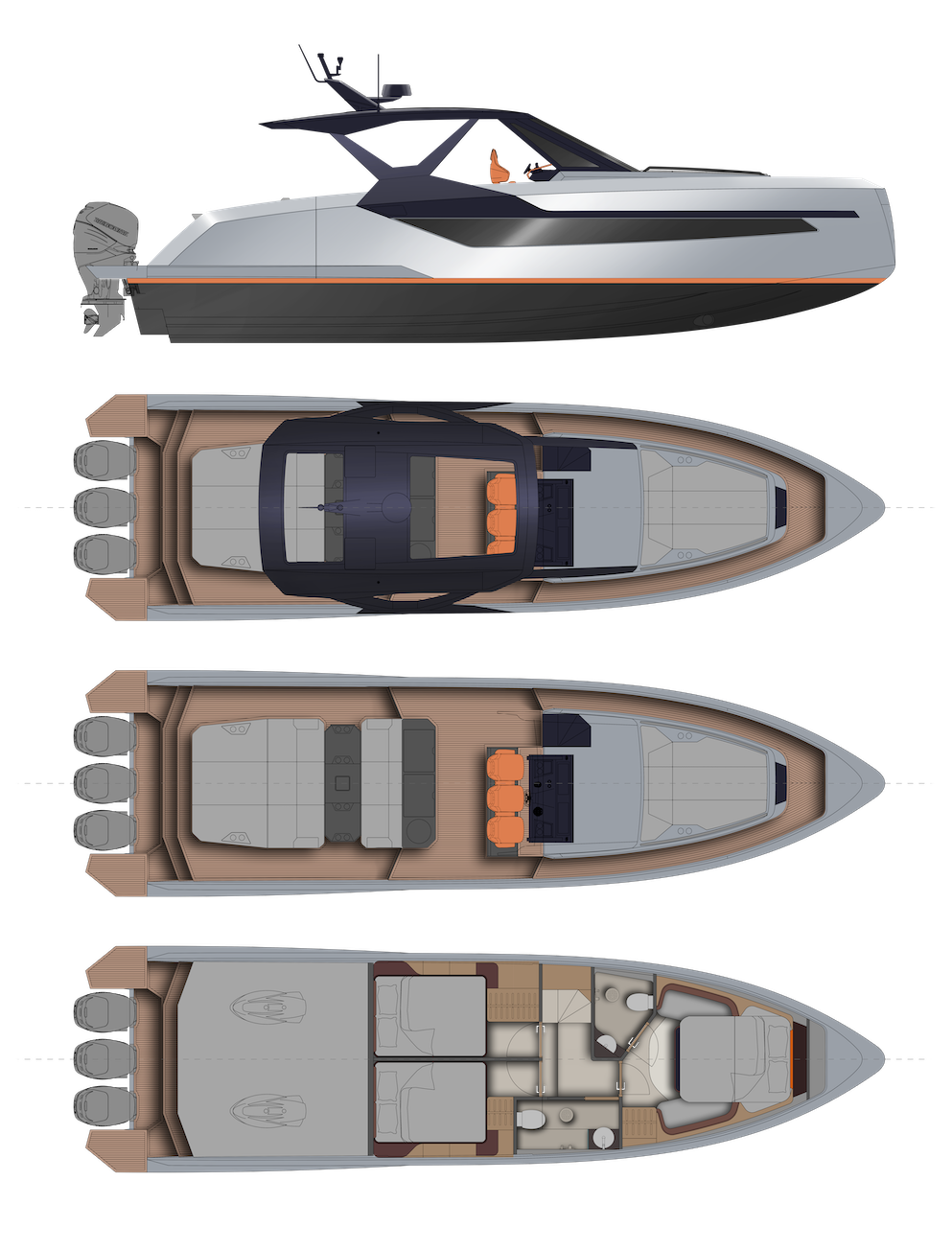 Der Raum an Bord ist optimal gestaltet, um maximalen Komfort und Vielseitigkeit zu bieten. Die Master-Suite lässt sich flexibel in einen großzügigen Innen-Essbereich verwandeln. Großzügige Außenflächen mit zwei Sonnendecks und intelligenten Staulösungen im Heck machen jede Ausfahrt zum Erlebnis.