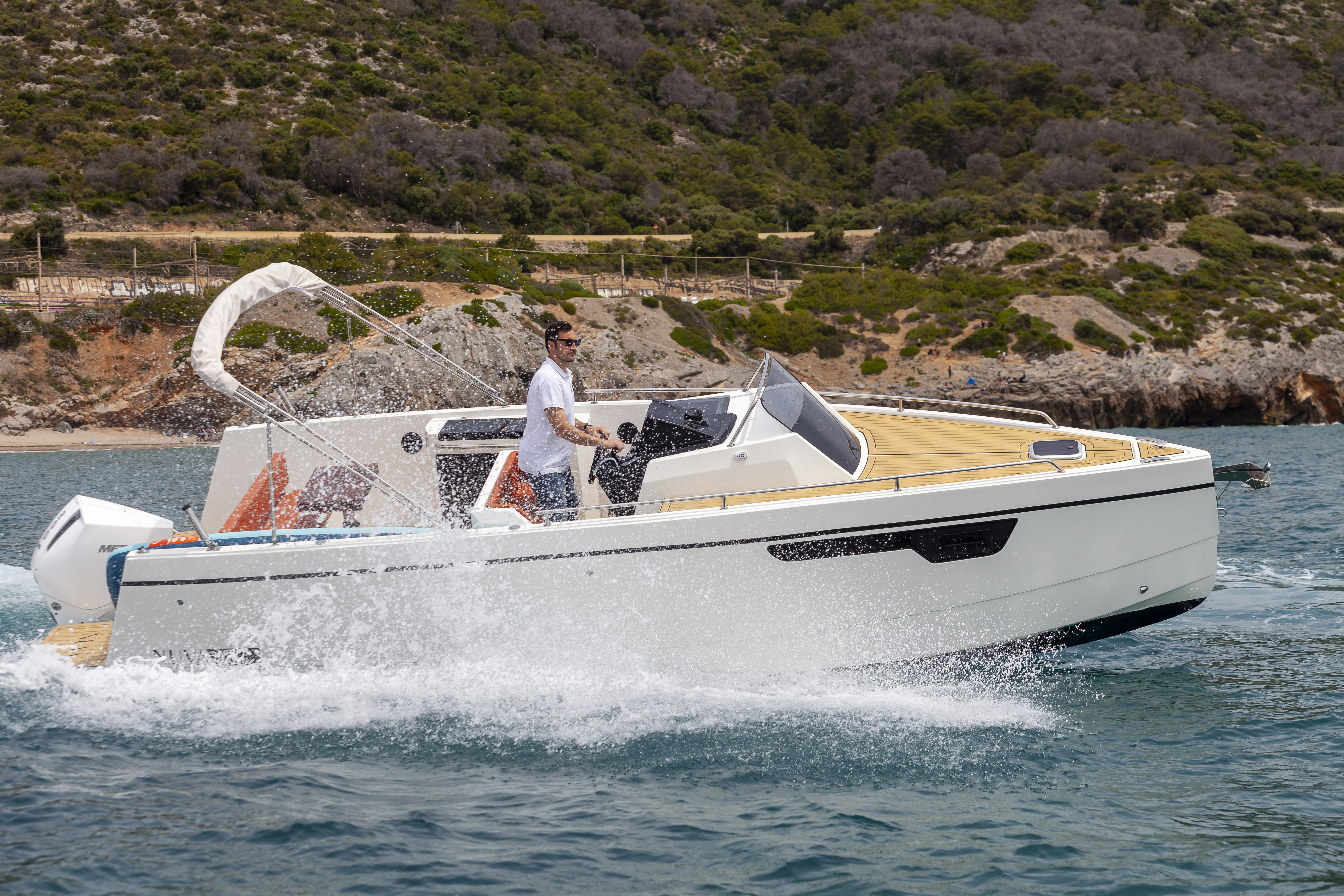 Mit Seadek, Reling, schwenkbarem Heck-Sitz, Multifunktionsplotter und individueller Polsterung ist die M8 Open Comfort bestens ausgestattet. Der 175-PS-Motor und die hydraulische Lenkung garantieren agile, kontrollierte Leistung, während Außenküche, Seeholztisch mit ausziehbarer Matratze und XXL-Kühlschrank das Bordleben perfekt abrunden. So wird jede Ausfahrt zu einem stilvollen, entspannten und unvergesslichen Erlebnis auf dem Meer.