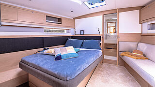 Die ebenso geräumige wie luxuriöse Eignerkabine bietet einen privilegierten privaten Raum zur Entspannung auf dem Schiff. Sie werden den großen Kleiderschrank und die zahlreichen Schränke zu schätzen wissen, die unendlich viel Stauraum bieten.