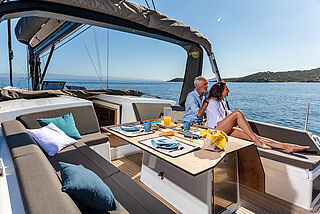 Den hinteren Teil vom Cockpit nutzt Dufour, um dort eine große Sonnenliege aufzubauen, welche sich mit einem flexiblen Mittelteil schnell zu einem zusätzlichen Cockpittisch konvertieren lässt.