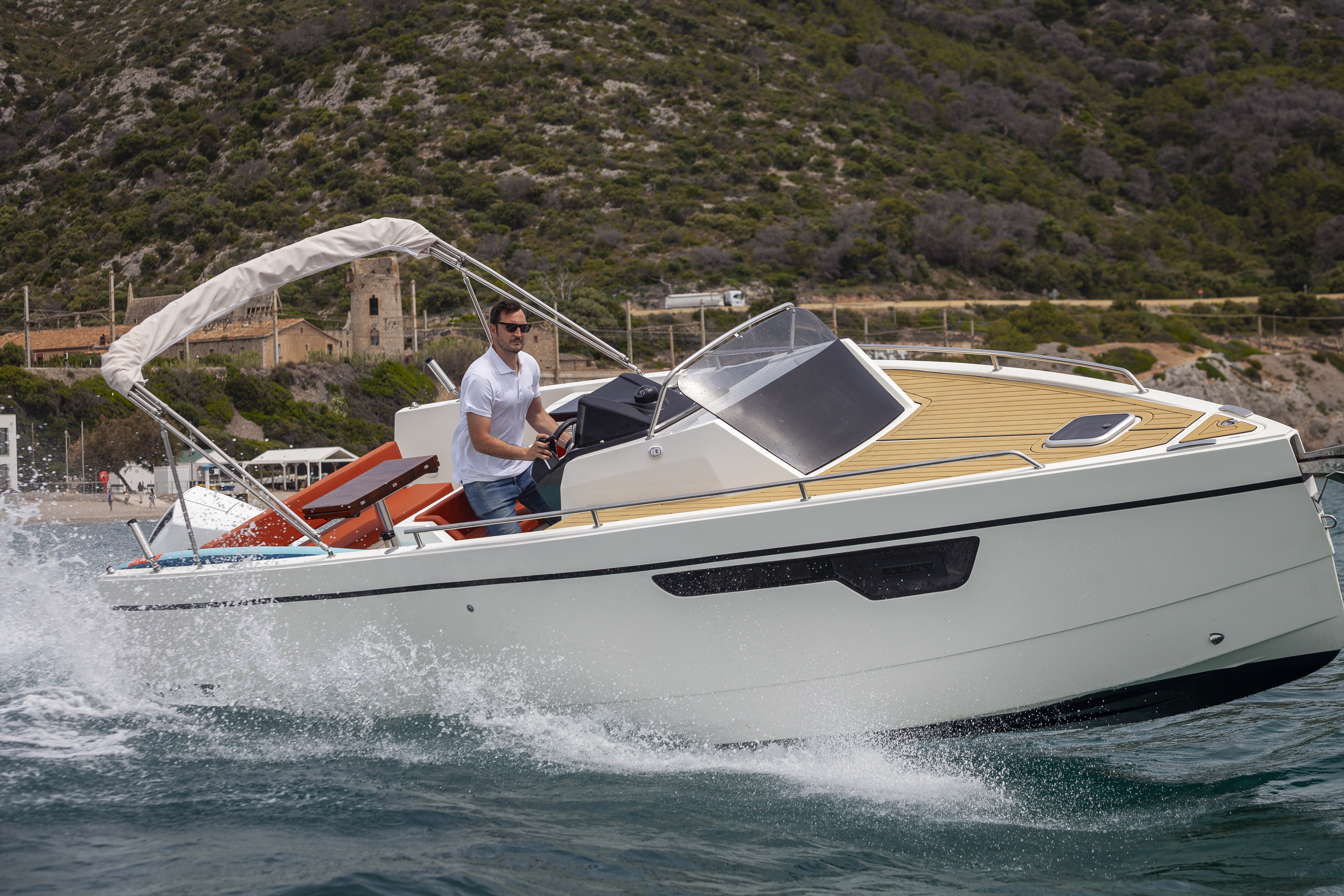 Das großzügige Sonnendeck am Bug und Heck lädt zum Entspannen ein, während clevere Stauraumlösungen – wie die Kabinenschublade mit Deckel und der variable Achtersitz – für Ordnung und Flexibilität sorgen. Die Pilotensitze, Edelstahl-Rückenlehnen und der umklappbare Fahrersitz bieten höchsten Komfort bei jeder Fahrt.